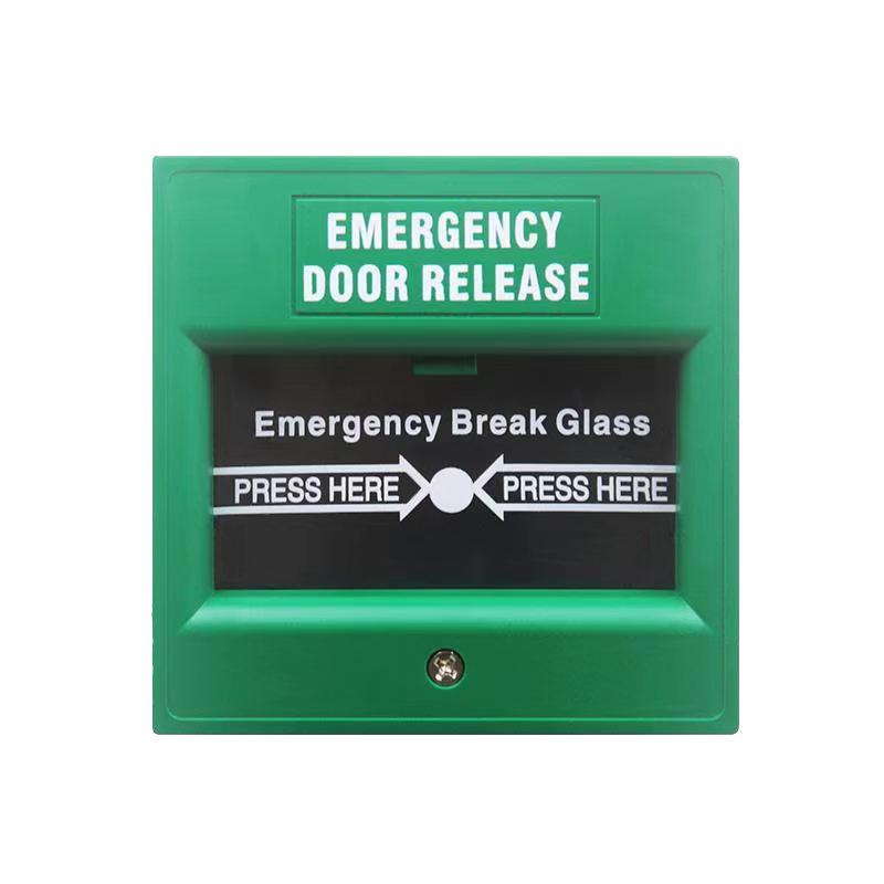 Pulsador desalida de emergencia; Carcasa plástica, verde, fácil de instalar; Con un conjunto de contacto unipolares NO, NC, COM; Envío de señal al romperse el vidrio; Medida 86*86*55mm.